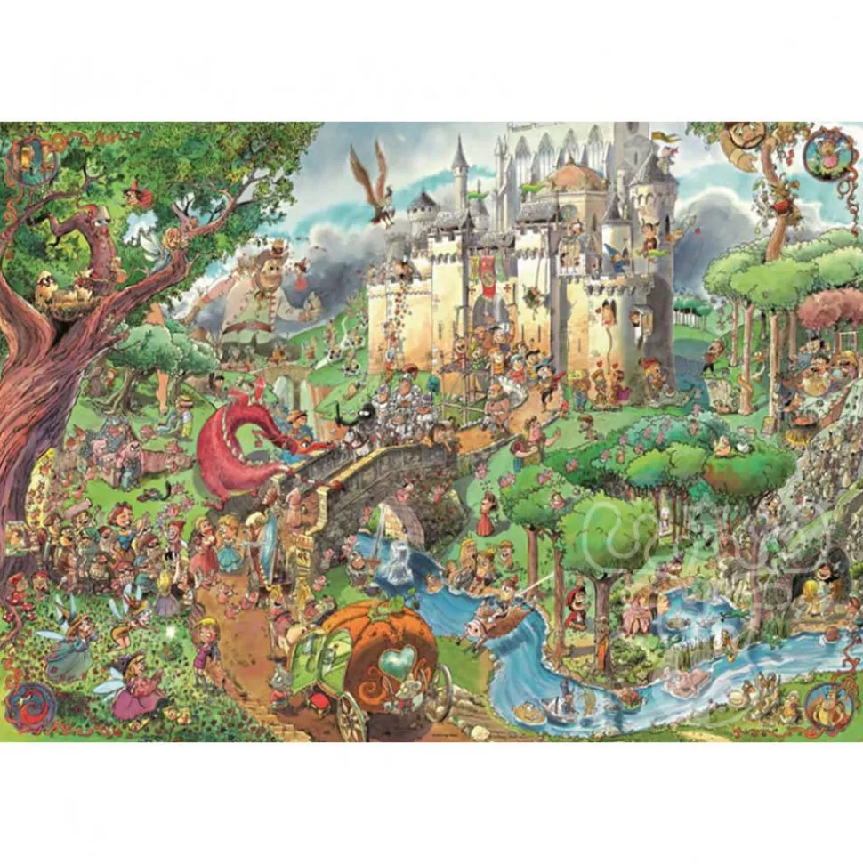 Fairy Tales has 1500 pieces and artwork by Hugo Prades. It features dozens of characters from well-loved fairy tales with a castle in the background. The finished puzzle measures 60 x 80 cm.