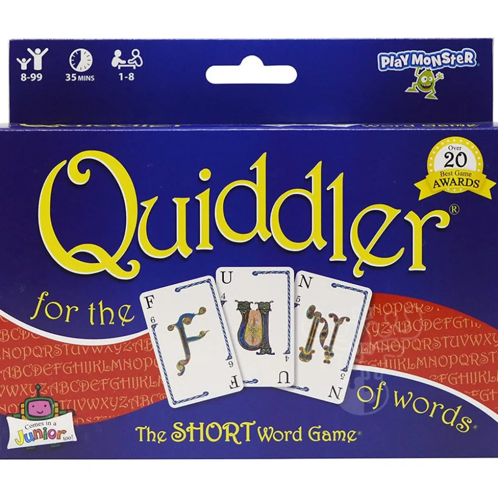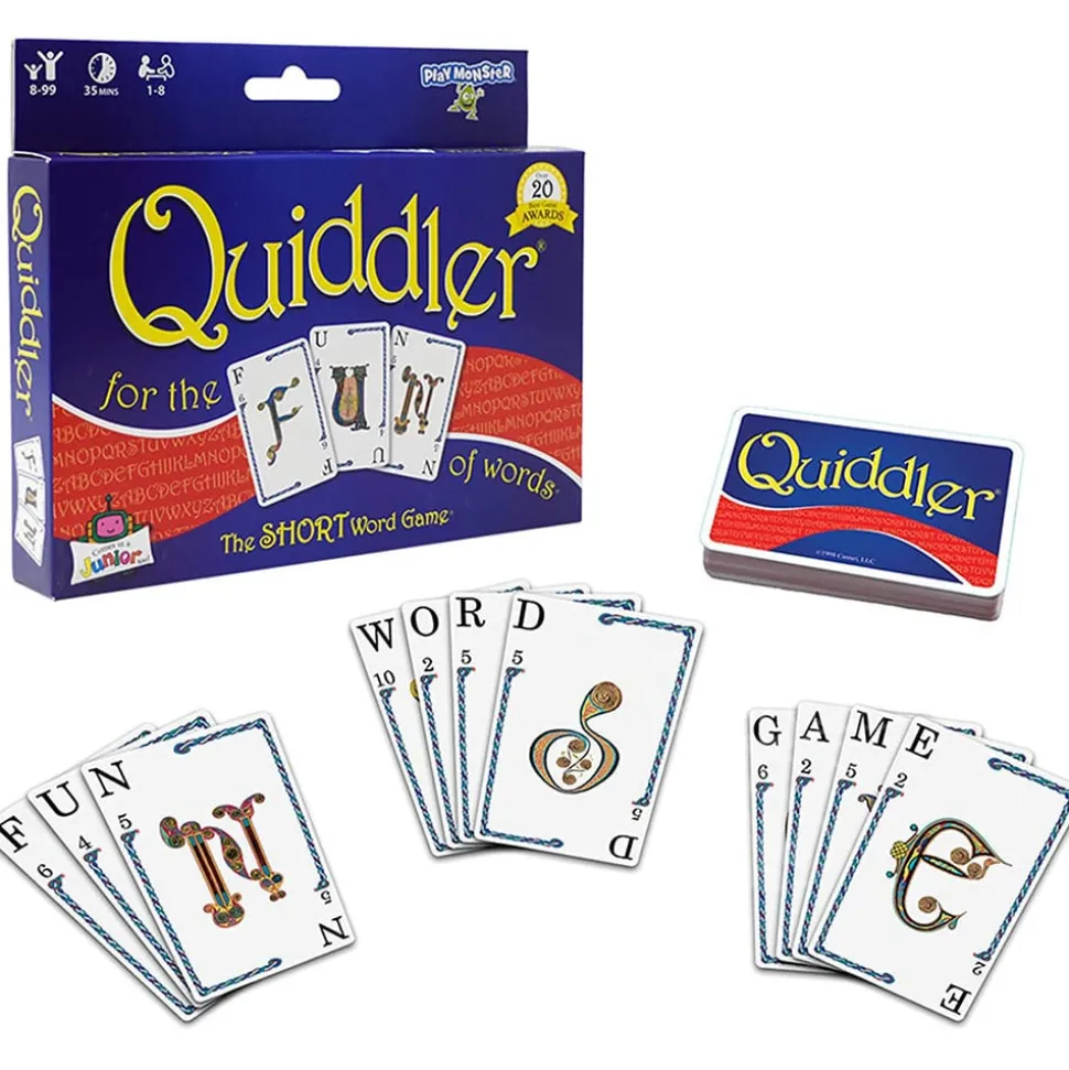 Quiddler challenges players to create words from an ever-increasing number of letter cards in their hand. The game lasts eight rounds, with three cards being dealt to each player in the first round, four cards in the second, five in the third, and so on. Each card has one or two letters on it as well as a point value.