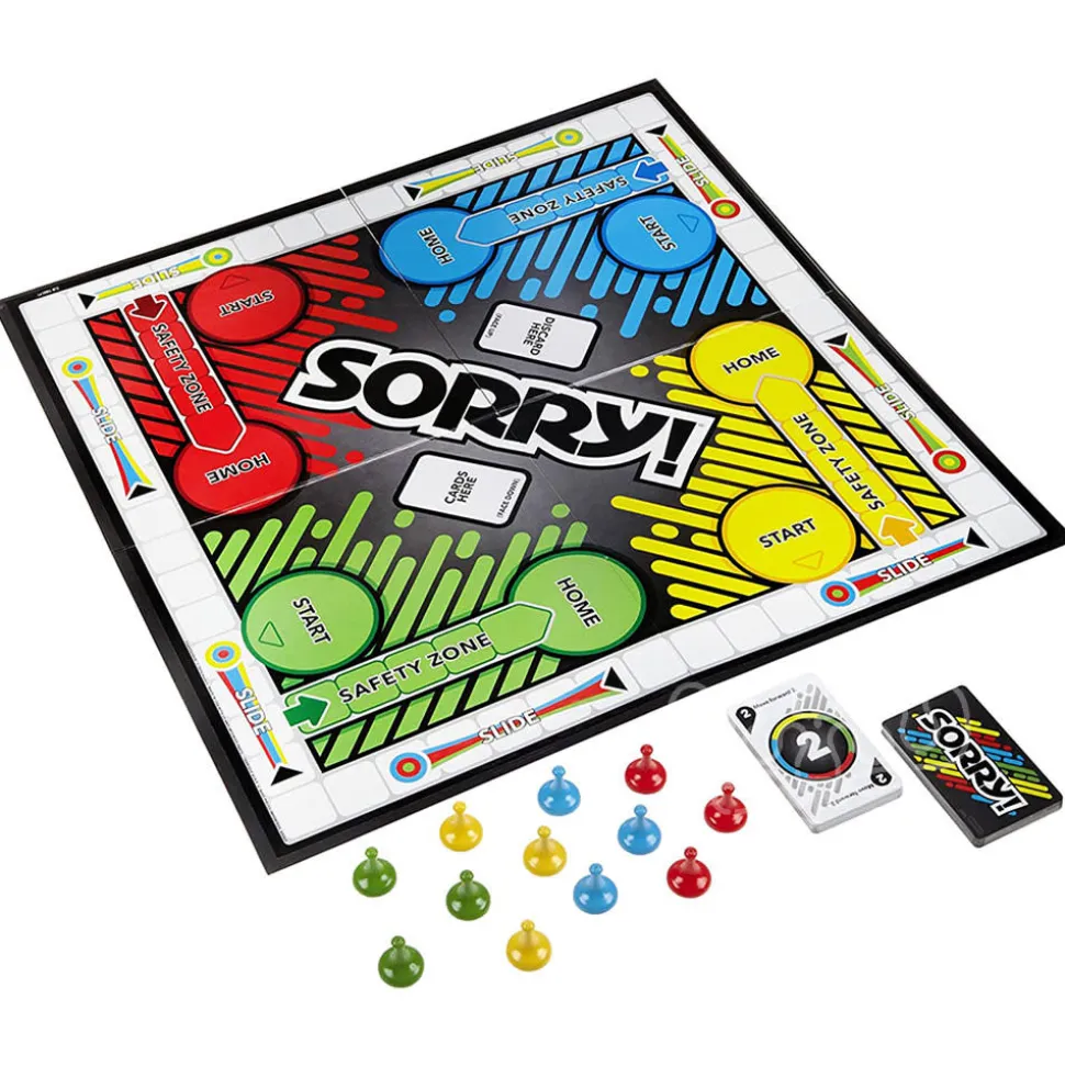 Slide, collide and score to win the game of Sorry! Draw cards to see how far you get to move one of your pawns on the board. If you land on a Slide you can zip to the end and bump your opponents’ pawns – or your own! Jump over pawns and hide in your Safety zone while getting powers with the 2 power-up tokens. Keep on moving and bumping until you get all three of your pawns from your color Start to your color Home. But watch out, because if you get bumped, Sorry! It’s all the way back to Start!